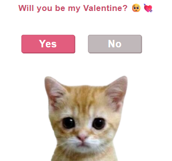Este código es una pregunta interactiva de San Valentín («Will you be my Valentine?»), divertida y romántica, perfecta para enviar a tu pareja. La página muestra la pregunta con una imagen adorable y dos botones: «Yes» y «No».